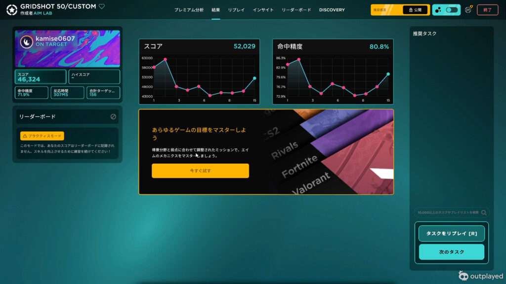 グリッドショットについてはハイスコアは61000ですが、アベレージ45000前後って感じです。